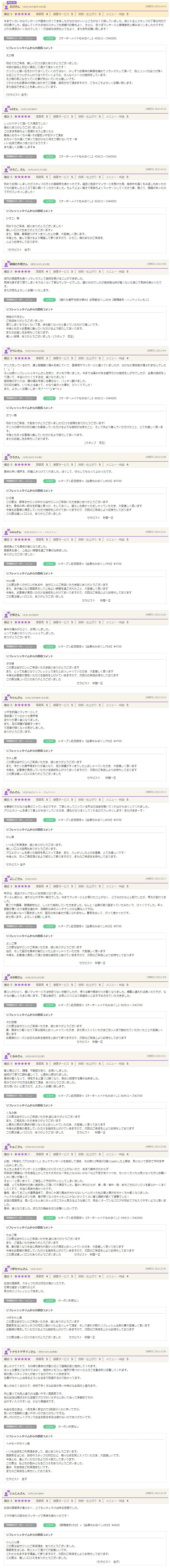 | どんなスタッフ | アロママッサージや足つぼが好き過ぎて、自分でも出来るようになりたいとお勉強してセラピストになりました。こんな風に解されたら気持ちいい…をコンセプトに施術しております。疲れた時はいつでもお越し下さい。日常のダルい重い感じをスッキリリフレッシュしましょう!心もカラダも軽くしますよ♪ |